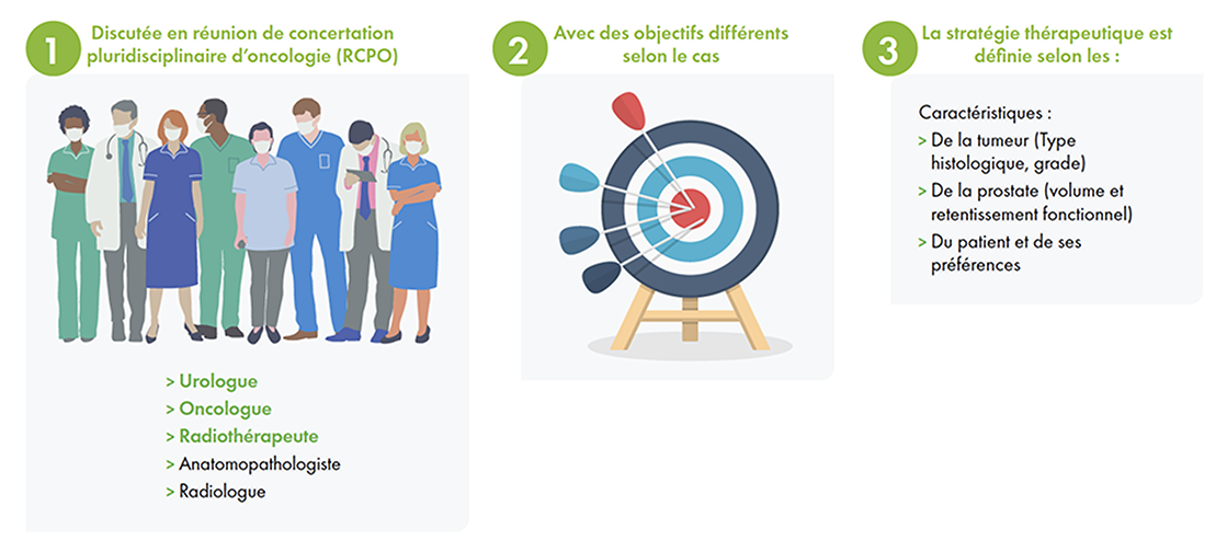 - Un traitement est initié en cas de signes évolutifs. L’objectif est d’éviter un traitement curatif immédiat potentiellement source de séquelles urinaires et sexuelles. -